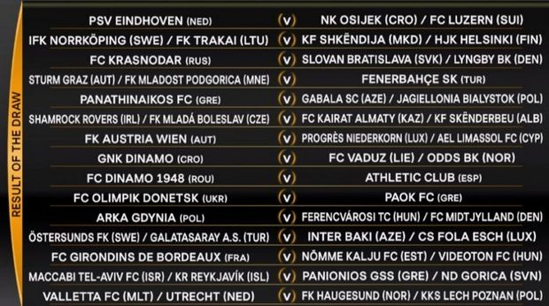 Ο Παναθηναϊκός θα αντιμετωπίσει το νικητή του ζευγαριού Γκαμπάλα (Αζερμπαϊτζάν)/Γιαγκελόνια (Πολωνία), ο ΠΑΟΚ την Ολίμπικ Ντόνετσκ από την Ουκρανία και ο Πανιώνιος, που πρέπει πρώτα να περάσει το εμπόδιο της Γκόριτσα θα κοντραριστεί με το νικητή του ζευγαριού Μακάμπι Τελ Αβίβ (Ισραήλ)/Ρέικιαβικ (Ισλανδία).