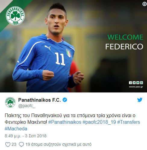 Παίκτης του Παναθηναϊκού για τα επόμενα τρία χρόνια είναι από το βράδυ της Δευτέρας ο 27χρονος Ιταλός επιθετικός Φεντερίκο Μακέντα, όπως ανακοινώθηκε από την ομάδα.