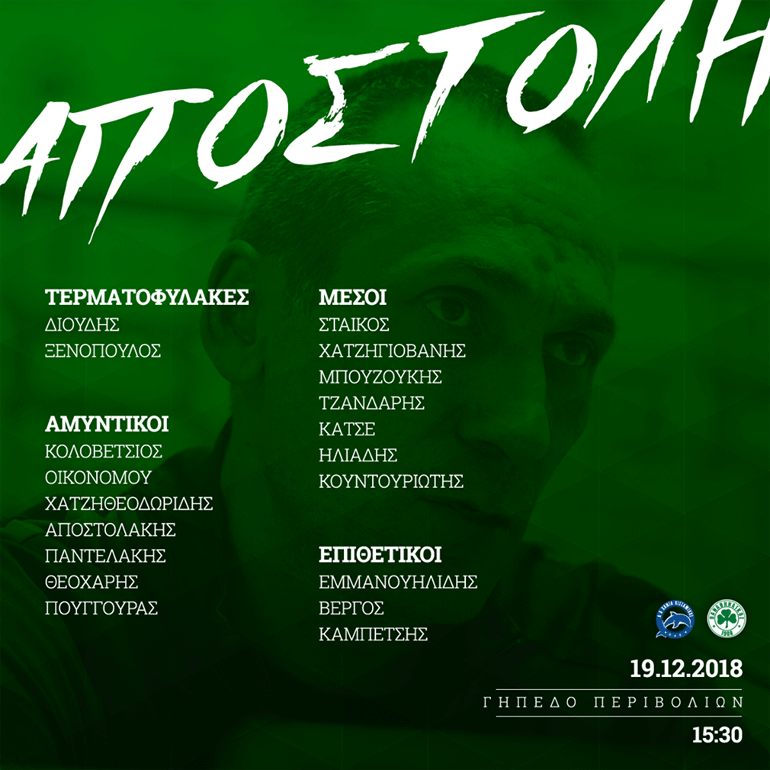 Ο τεχνικός των «πράσινων» δεν συμπεριέλαβε τους τραυματίες Κότσαρη, Άλτμαν, Κουρμπέλη και Μακέντα, τους ανέτοιμους Κουλιμπαλί και Μουνιέ και τους Μαυρομμάτη, Ινσούα, Γιόχανσον και Δώνη.