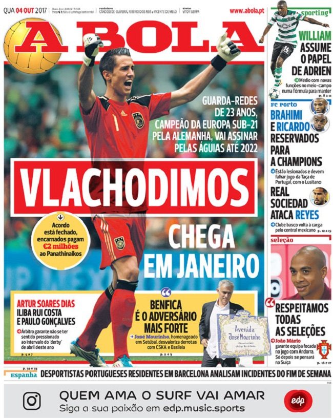 Ο Οδυσσέας Βλαχοδήμος αποχωρεί από τον Παναθηναϊκό και από τον Ιανουάριο θα αγωνίζεται στην Μπενφίκα. Σύμφωνα με το πρωτοσέλιδο της εφημερίδας «A Bola», οι «αετοί» θα αποκτήσουν τον 23χρονο κίπερ του «τριφυλλιού» έναντι 2 εκατ. ευρώ.