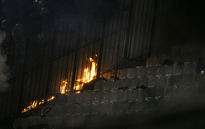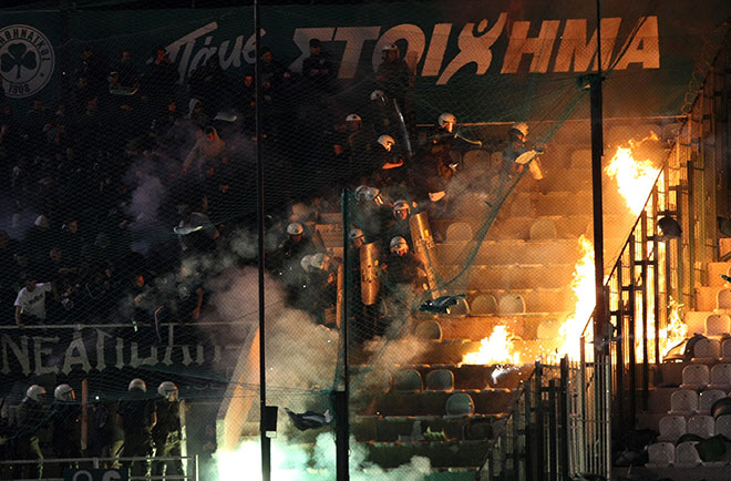 Ξέφυγε η κατάσταση στο γήπεδο της Λεωφόρου Αλεξάνδρας μετά και το τελευταίο σφύριγμα στην αναμέτρηση του Παναθηναϊκού με τον ΠΑΟΚ. Μετά τα επεισόδια που σημειώθηκαν πριν από την έναρξη του αγώνα, ένταση προκλήθηκε και στο φινάλε του ματς όταν οπαδοί του Παναθηναϊκού εκτόξευσαν βόμβες μολότοφ προς την κερκίδα όπου φιλοξενούνταν οι 300 φίλοι του «Δικεφάλου του Βορρά» με αποτέλεσμα να πάρουν φωτιά κάποια καθίσματα, χωρίς ευτυχώς να υπάρξει κάποιος τραυματισμός.