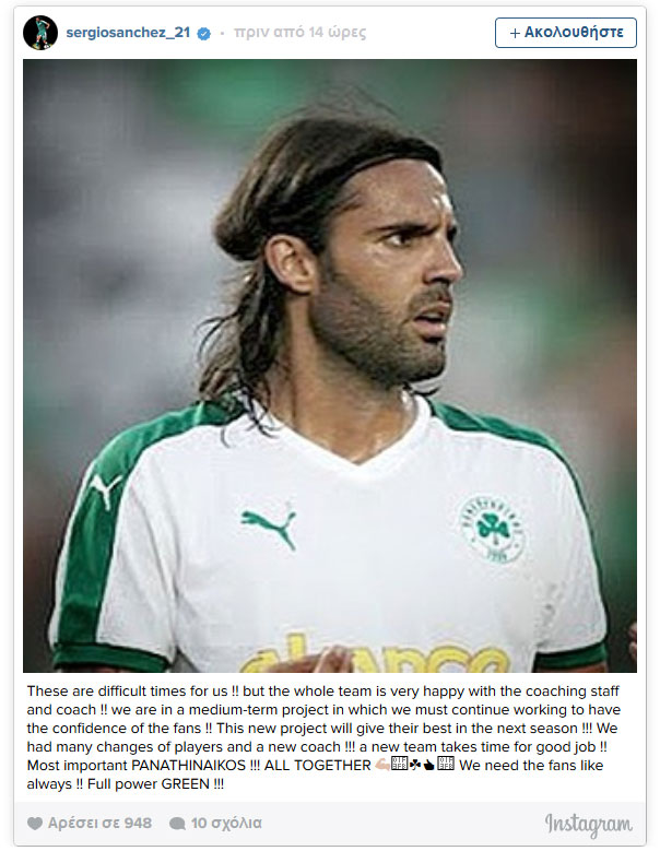 » Το σημαντικότερο είναι ο Παναθηναϊκός!!! Όλοι μαζί. Χρειαζόμαστε, όπως πάντα, τους οπαδούς!! Πάμε γερά πράσινοι» έγραψε χαρακτηριστικά ο Ισπανός αμυντικός, ο οποίος μετρά αντίστροφα για την επιστροφή του στη δράση μετά τον τραυματισμό του.
