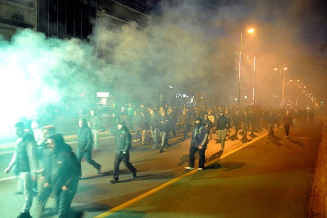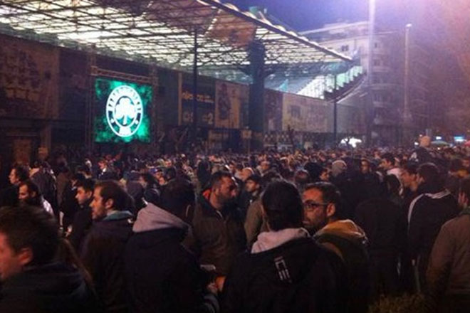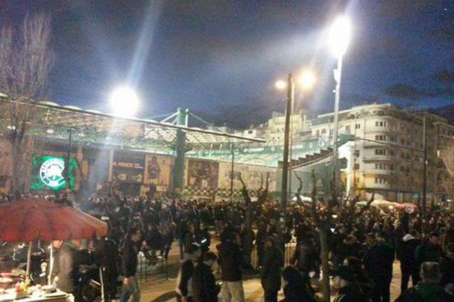 Οι φίλοι των «πράσινων» συγκεντρώθηκαν έξω από την Θύρα 3 και, κλείνοντας τη Λεωφόρο Αλεξάνδρας και στα δυο της ρεύματα, διαμαρτυρήθηκαν για την αφαίρεση των τριών βαθμών για τα επεισόδια στο ντέρμπι των «αιωνίων», ενώ δεν έλειψαν και τα υβριστικά συνθήματα εναντίον του Βαγγέλη Μαρινάκη.