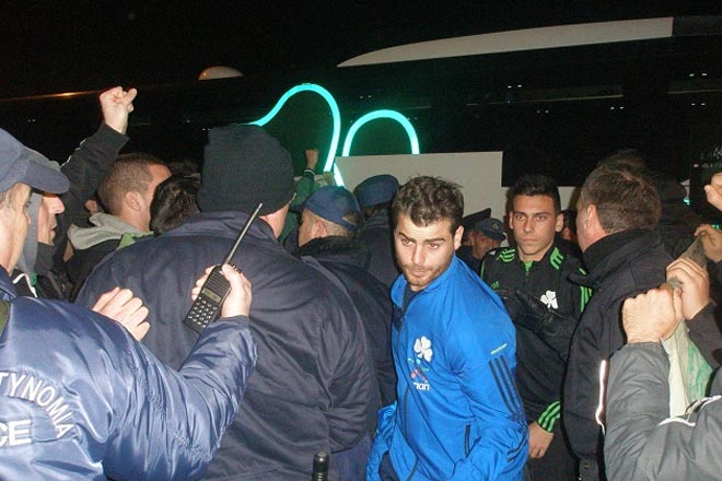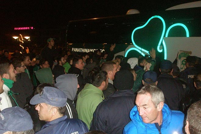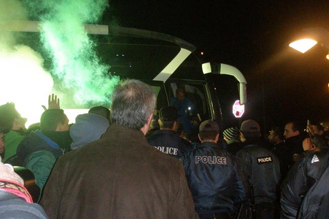 Οι οπαδοί των πράσινων περίμεναν το πούλμαν των πράσινων έξω από το ξενοδοχείο και μόλις έκανε την εμφάνισή του αποθέωσαν τους παίκτες του Αναστασίου με συνθήματα, κάνοντας παράλληλα τη νύχτα μέρα με τα δεκάδες καπνογόνα που άναψαν.