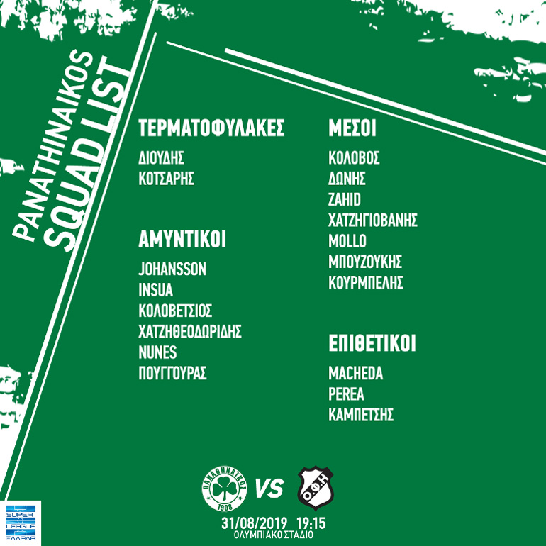 Συγκεκριμένα, την αποστολή των «πράσινων» απαρτίζουν οι: Διούδης, Κότσαρης, Γιόχανσον, Ινσούα, Κολοβέτσιος, Χατζηθεοδωρίδης, Πούγγουρας, Νούνες, Κολοβός, Δώνης, Ζαχίντ, Χατζηγιοβάνης, Μολό, Μπουζούκης, Κουρμπέλης, Μακέντα, Περέα και Καμπετσής.