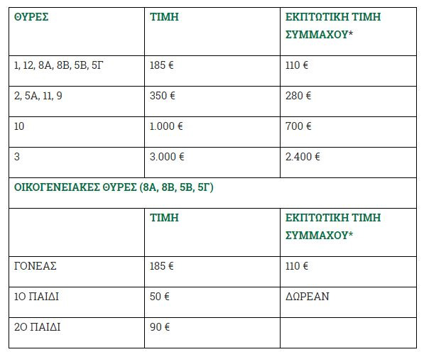 *Δεν συμπεριλαμβάνεται η ετήσια συνδρομή της Παναθηναϊκής συμμαχίας τόσο για τους ενήλικες (50 €) όσο και για τα παιδιά (20 € e-membership). Περισσότερα στο paomprosta.gr.
