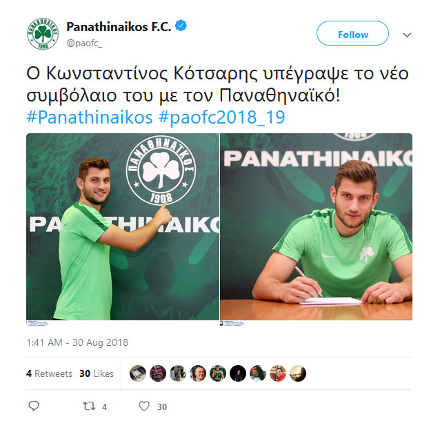 Eν τω μεταξύ το νέο του συμβόλαιο με τον Παναθηναϊκό υπέγραψε ο Κώστας Κότσαρης, που τον «δένει» μέχρι το 2020 στο «τριφύλλι», όπως ενημέρωσε η «πράσινη» ΠΑΕ μέσω του λογαριασμού της στο twitter.