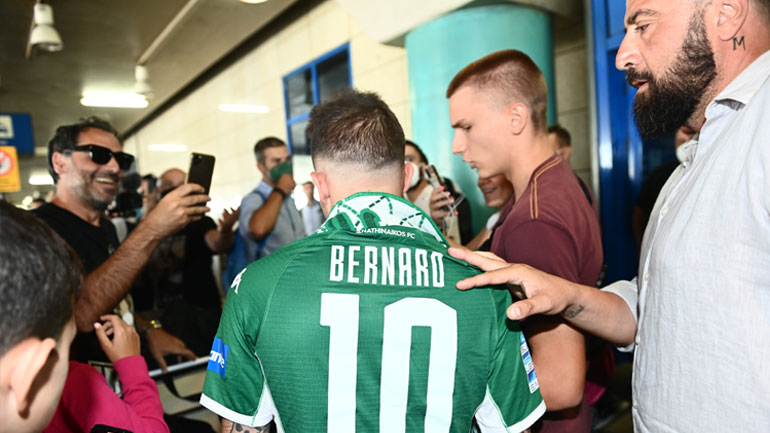 Ο Μπερνάρ έκανε την εμφάνισή του φορώντας την πράσινη φανέλα με το Νο 10 στην πλάτη, με 100 φιλάθλους του Παναθηναϊκού να τον περιμένουν και να τον αποθεώνουν φωνάζοντας ρυθμικά το όνομά του.