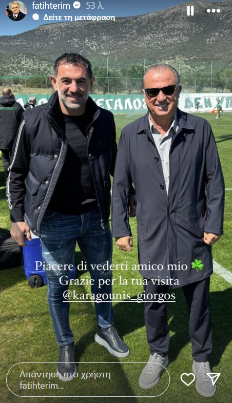 Συνάντηση στο «Γ. Καλαφάτης» είχαν το μεσημέρι του Σαββάτου (23/3) ο Γιώργος Καραγκούνης και ο Φατίχ Τερίμ, με τον Τούρκο τεχνικό να ευχαριστεί τον πρώην Έλληνα διεθνή για την παρουσία του στο προπονητικό κέντρο του συλλόγου.