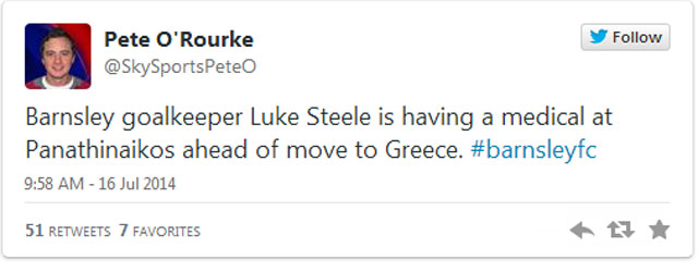 Συγκεκριμένα, ο Πέτε Ο’ Ρουρκ αναφέρει ότι ο «τερματοφύλακας της Μπάρνσλεϊ Λουκ Στιλ περνάει ιατρικές εξετάσεις στον Παναθηναϊκό για να παίξει του χρόνου στην Ελλάδα».
