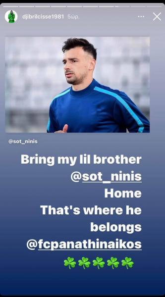 «Φέρτε πίσω τον μικρό μου αδελφό, Σωτήρη Νίνη. Εκεί ανήκει, στον Παναθηναϊκό», έγραψε σχετικά στην ανάρτησή του ο Σισέ για τον άλλοτε συμπαίκτη του (2009/11) στην ελληνική ομάδα.