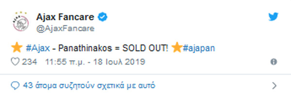 Τα εισιτήρια για τη συγκεκριμένη αναμέτρηση εξαντλήθηκαν, με τον Αίαντα να ενημερώνει μέσω των λογαριασμών του στα social media το «sold out» στο εν λόγω ματς.