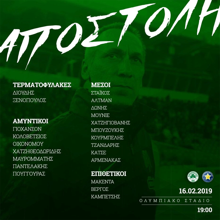 Αναλυτικά η αποστολή του Παναθηναϊκού: Διούδης, Ξενόπουλος, Γιόχανσον, Κολοβέτσιος, Οικονόμου, Χατζηθεοδωρίδης, Μαυρομμάτης, Παντελάκης, Πούγγουρας, Στάικος, Αλτμαν, Δώνης, Μουνιέ, Χατζηγιοβάνης, Μπουζούκης, Τζανδάρης, Κάτσε, Αρμενάκας, Μακέντα, Βέργος και Καμπετσής.