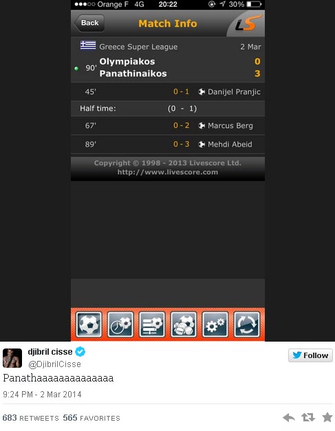 Ο Γάλλος επιθετικός μετά τη λήξη του παιχνιδιού στο «Καραϊσκάκη» έγραψε στο Twitter: «Πανάθααααα», δείχνοντας ότι συνεχίζει να είναι δεμένος με την αθηναϊκή ομάδα.