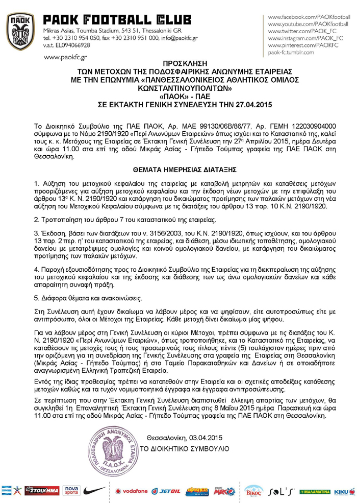 Το Διοικητικό Συμβούλιο της ΠΑΕ ΠΑΟΚ προσκάλεσε τους μετόχους της εταιρίας στην Έκτακτη Γενική Συνέλευση, που θα διεξαχθεί την Δευτέρα 27 Απριλίου 2015 στις 11.00 στα γραφεία της ΠΑΕ στο γήπεδο της Τούμπας.