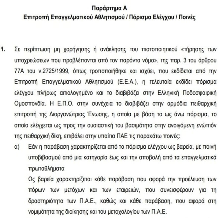 Όπως τονίζεται αναφορικά με την δικαιοδοσία της ΕΕΑ σε ανάλογες περιπτώσεις: «Σε περίπτωση μη χορήγησης ή ανάκλησης του πιστοποιητικού «τήρησης των υποχρεώσεων που προβλέπονται από τον παρόντα νόμα», της παρ. 3 του άρθρου 77Α του ν.2725/1999 όπως τροποποιήθηκε και ισχύει, που εκδίδεται από την Επιτροπή Επαγγελματικού Αθλητισμού (Ε.Ε.Α.) η τελευταία εκδίδει πόρισμα ελέγχου πλήρως αιτιολογημένο και το διαβιβάσει στην Ελληνική Ποδοσφαιρική Ομοσπονδία. Η Ε.Π.Ο, στην συνέχεια το διαβιβάζει στην αρμόδια πειθαρχική επιτροπή της Διοργανώτριας Ένωσης, η οποία με βάση το άνω πόρισμα, το οποίο ελέγχεται ως προς την ουσιαστική του βασιμότητα στην ανοιγόμενη ενώπιόν της πειθαρχική δίκη, επιβάλλει στην υπαίτια ΠΑΕ τις παρακάτω ποινές…».