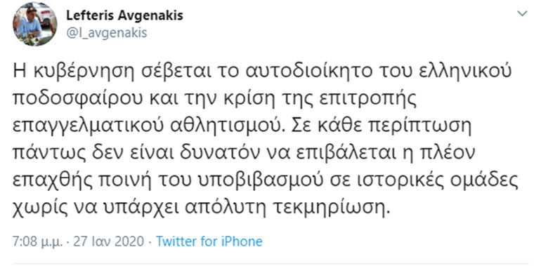 «Η κυβέρνηση σέβεται το αυτοδιοίκητο του ελληνικού ποδοσφαίρου και την κρίση της επιτροπής επαγγελματικού αθλητισμού. Σε κάθε περίπτωση πάντως δεν είναι δυνατόν να επιβάλεται η πλέον επαχθής ποινή του υποβιβασμού σε ιστορικές ομάδες χωρίς να υπάρχει απόλυτη τεκμηρίωση», έγραψε στον προσωπικό του λογαριασμό στο Twitter ο Λ. Αυγενάκης.