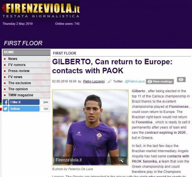 Όπως χαρακτηριστικά αναφέρει ιστοσελίδα που πρόσκειται στους «βιόλα»: «Ο Ζιλμπέτρο θα μπορούσε σύντομα να επιστρέψει στην Ευρώπη. Ο Βραζιλιάνος -ωστόσο- δεν θα γυρίσει για λογαριασμό της Φιορεντίνα, η οποία είναι έτοιμη να τον πουλήσει, αν και το συμβόλαιο του λήγει το 2020.