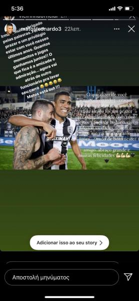 Ο Αντελίνο Βιεϊρίνια, αποχαιρέτησε μέσω των social media τον Λέο Μάτος, καθώς ως γνωστόν ο Βραζιλιάνος μπακ αποχώρησε από τον ΠΑΟΚ και θα συνεχίσει την καριέρα του στη Βάσκο ντα Γκάμα, η οποία την Τρίτη ανακοίνωσε κι επίσημα την απόκτησή του.
