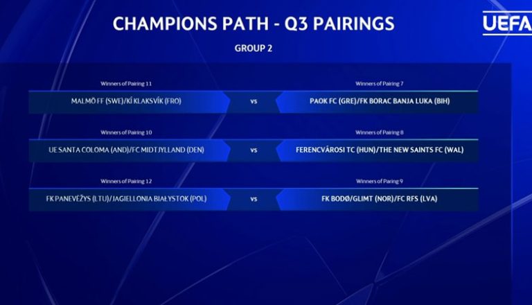 Τον νικητή του ζευγαριού Μάλμε (Σουηδία)-Κλάκσβικ (Νησιά Φερόε) για τον β΄ προκριματικό γύρο θα αντιμετωπίσει ο ΠΑΟΚ στον γ΄ προκριματικό γύρο του Champions League, όπως προέκυψε από τη σχετική κλήρωση που πραγματοποιήθηκε σήμερα (22/7) στην έδρα της UEFA, στη Νιόν της Ελβετίας, εφόσον ο «Δικέφαλος του βορρά» ξεπεράσει το «εμπόδιο» της Μπόρατς Μπάνια Λούκα από τη Βοσνία/Ερζεγοβίνη.