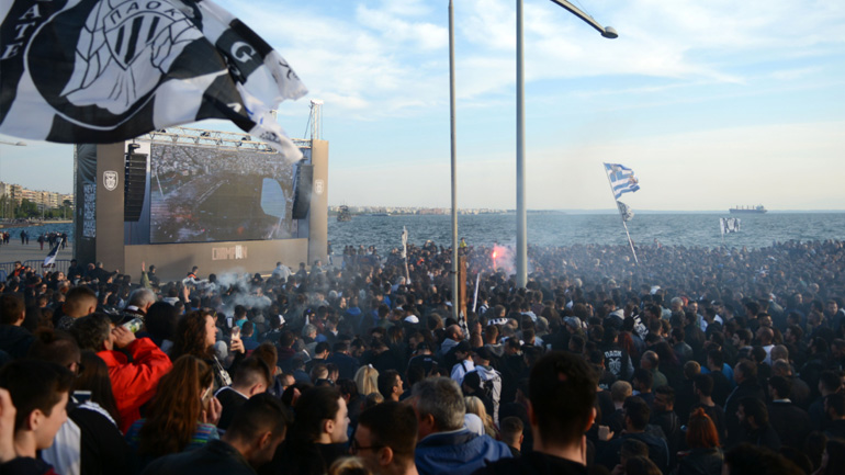Όπως είναι φυσικό όλη η πόλη και ειδικότερα το κέντρο της, η Τούμπα και η Πλατεία του Λευκού Πύργου είχαν από το πρωί έντονο ασπρόμαυρο χρώμα με σημαίες της ομάδας να ανεμίζουν σε μπαλκόνια και στα καταστήματα, αλλά και σε όλους σχεδόν τους δρόμους της πόλης.