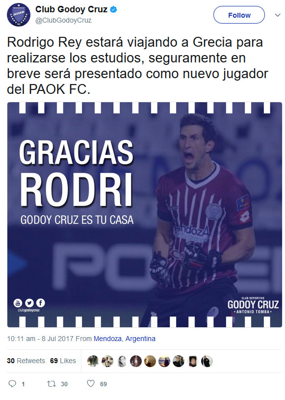 Τη συμφωνία της με τον ΠΑΟΚ για την παραχώρηση του Ροντρίγκο Ρέι γνωστοποίησε η Γοδόι Κρουζ.