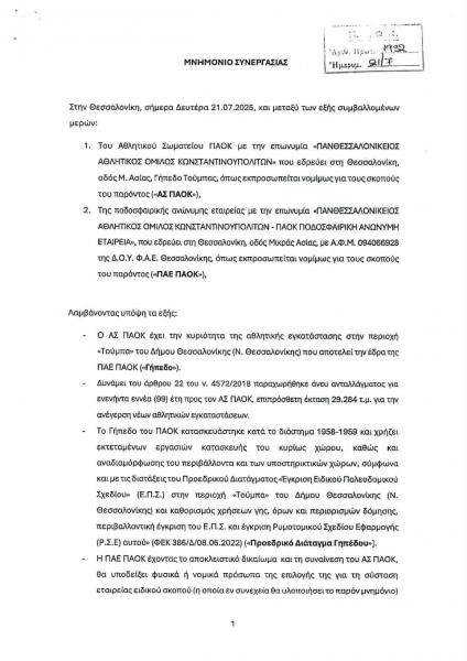 Στις 21 Ιουλίου 2025, σε επίσημη συνάντηση των εκπροσώπων της ΠΑΕ ΠΑΟΚ με τους κυρίους Ησαϊάδη, Μπεκιάρη και Πατρίδα, τους παραδόθηκε το προτεινόμενο μνημόνιο συνεργασίας από την πλευρά μας (με σκοπό να διανεμηθεί και στα υπόλοιπα μέλη του Δ.Σ.), το οποίο τους αναλύθηκε διεξοδικά και τους παρουσιάστηκαν μελέτες, σχέδια, τοπογραφικά κ.α., τα οποία έχουν πραγματοποιηθεί και έχουν πληρωθεί από την ΠΑΕ ΠΑΟΚ. Την ίδια στιγμή γνωστοποιήσαμε στο κοινό τα βασικά σημεία της πρότασης μας.