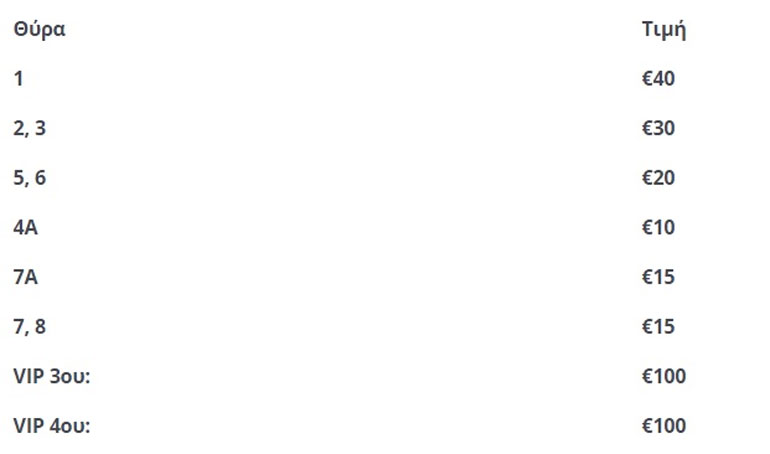 Οι τιμές των εισιτηρίων είναι οι εξής: