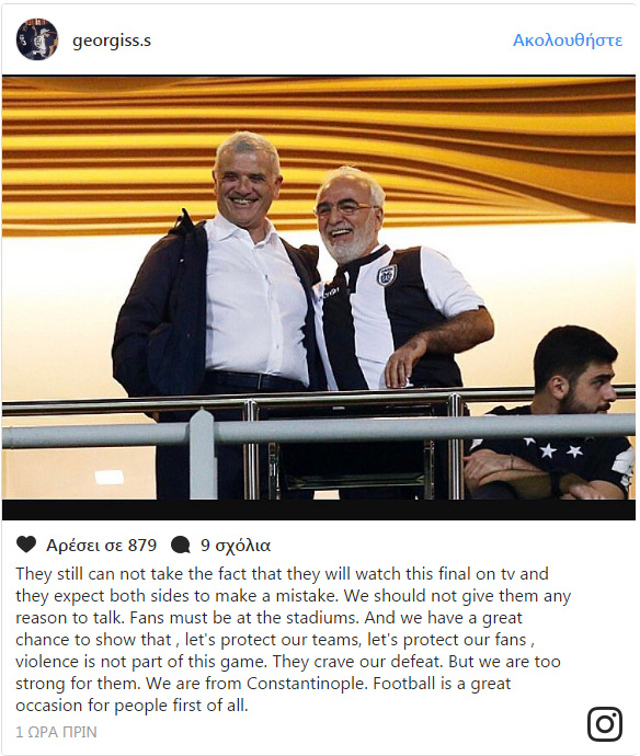 Ο Γιώργος Σαββίδης ανέβασε φωτογραφία του Ιβάν Σαββίδη μαζί με τον Δημήτρη Μελισσανίδη στο Instagram, γράφοντας: «Ακόμα δεν μπορούν να δεχθούν το γεγονός ότι θα παρακολουθήσουν τον τελικό από την τηλεόραση και περιμένουν και τις δύο πλευρές να κάνουν ένα λάθος. Δεν πρέπει να τους δώσουμε άλλη αιτία να μιλάνε.