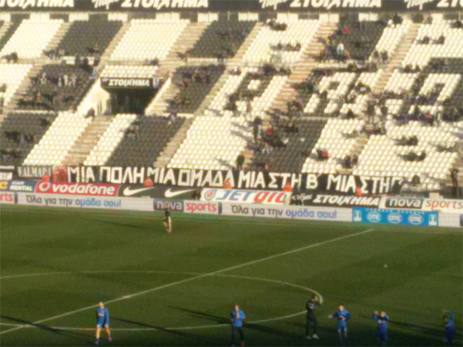 Η απάντηση των οπαδών του ΠΑΟΚ- που δεν αφήνουν τίποτα να πέσει κάτω- ήρθε πριν από λίγο στα κάγκελα της Τούμπας, όπου ανάρτησαν πανό με τη φράση «Μια πόλη-Μια ομάδα-Μια στη Β΄-Μια στη Γ»!