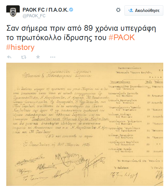 Η ομάδα του ΠΑΟΚ ιδρύθηκε πριν από 89 χρόνια, την 12η Απριλίου, ωστόσο σαν σήμερα υπεγράφη το πρωτόκολλο ίδρυσης του «Δικεφάλου του Βορρά». Η ΠΑΕ ΠΑΟΚ μέσω του twitter υπενθύμισε την σημαντική ημερομηνία και έβγαλε στην δημοσιότητα το έγγραφο-ντοκουμέντο.