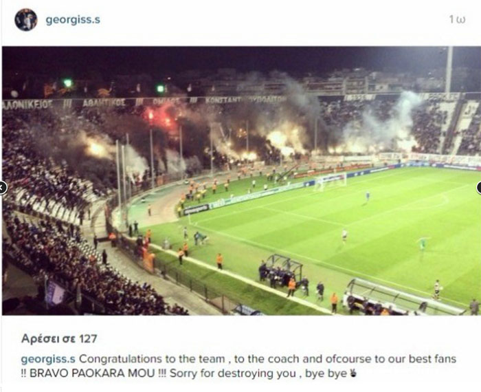 «Συγχαρητήρια στην ομάδα, τον προπονητή και φυσικά στους φιλάθλους μας που είναι οι καλύτεροι! Μπράβο ΠΑΟΚάρα μου! Συγνώμη που σας καταστρέψαμε, bye bye», ήταν χαρακτηριστικά το μήνυμα του Γιώργου Σαββίδη, που συνοδευόταν από μία φωτογραφία από την Τούμπα.