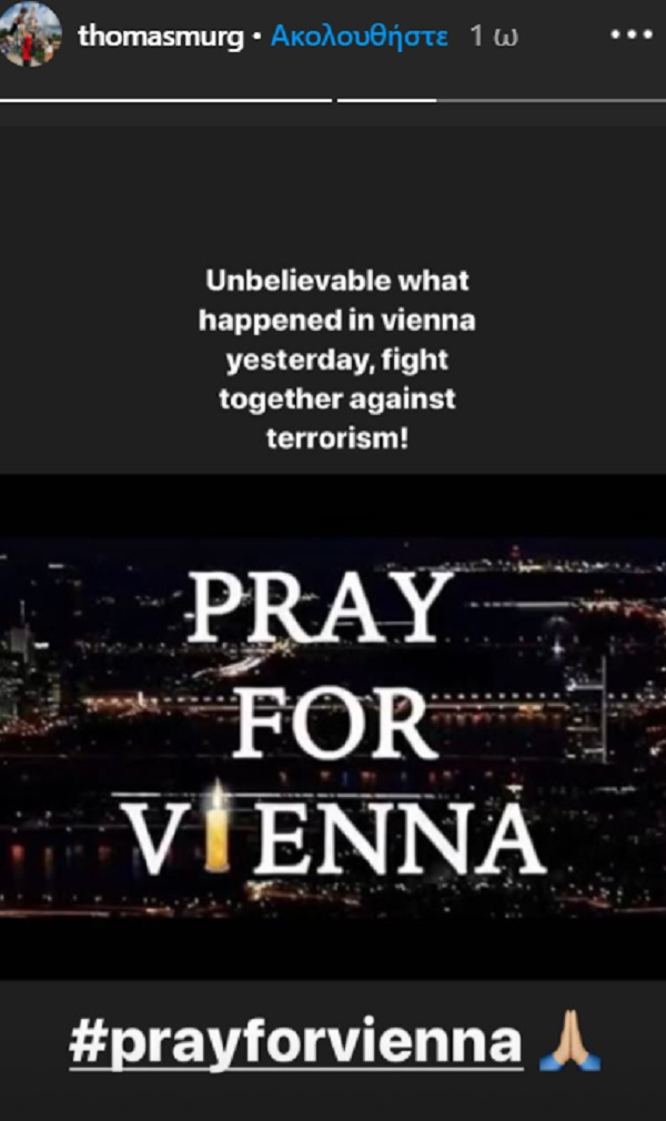 «Απίστευτο αυτό που συνέβη χθες στη Βιέννη. Να παλέψουμε όλοι μαζί ενάντια στην τρομοκρατία!» έγραψε στο Instagram ο Αυστριακός μεσοεπιθετικός του ΠΑΟΚ, που ζούσε μέχρι πριν λίγες εβδομάδες στην πρωτεύουσα της χώρας του.