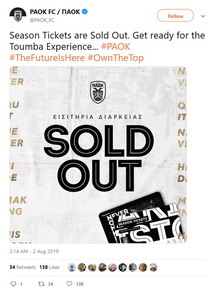 Η ΠΑΕ ΠΑΟΚ ανακοίνωσε ότι εξαντλήθηκαν οι 22.000 κάρτες που είχε θέσει στη διάθεση των φίλων του. Μετά την περσινή σεζόν που έκλεισε με νταμπλ για τον «δικέφαλο του Βορρά» οι φίλοι του διψούν να βρεθούν στην Τούμπα.