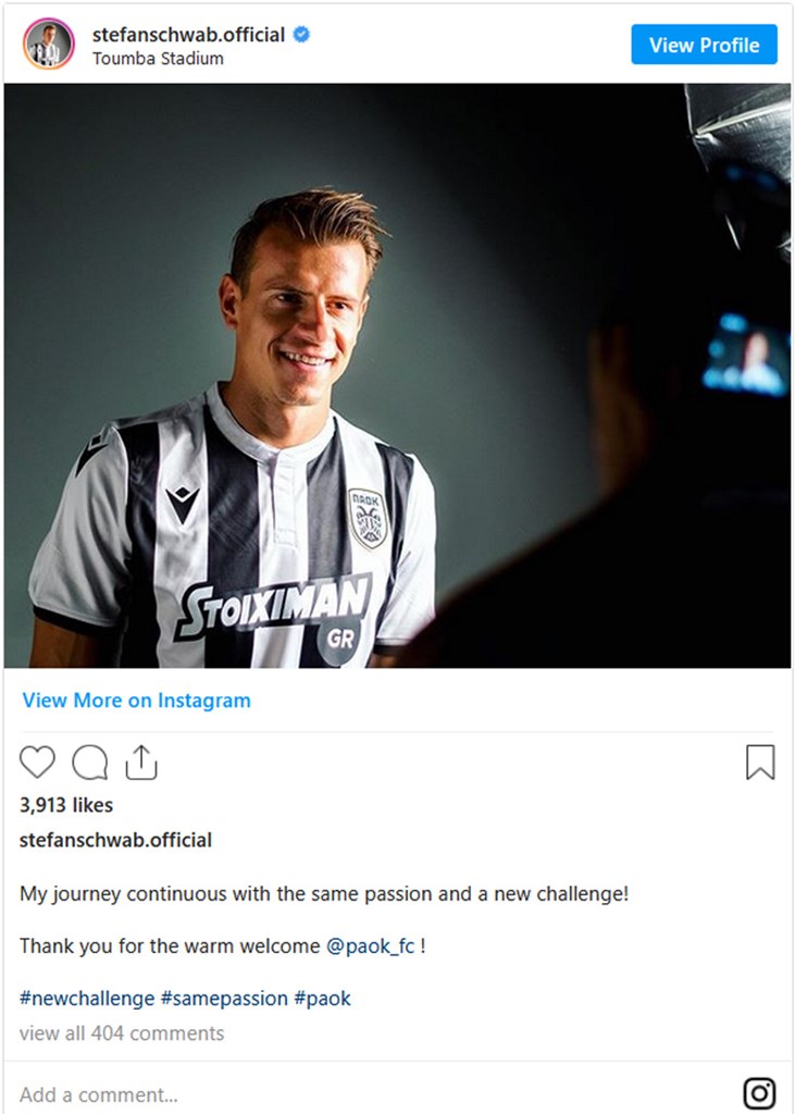 Ο Στέφαν Σβαμπ μετακόμισε στον ΠΑΟΚ και έκανε την πρώτη του τοποθέτηση ως παίκτης του «Δικεφάλου του Βορρά». Ο Αυστριακός μέσος έγραψε στο προφίλ που διατηρεί στο Instagram: