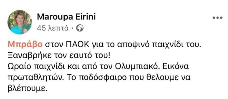 «Μπράβο στον ΠΑΟΚ για το αποψινό παιχνίδι του. Ξαναβρήκε τον εαυτό του. Ωραίο παιχνίδι και από τον Ολυμπιακό. Εικόνα πρωταθλητών. Το ποδόσφαιρο που θέλουμε να βλέπουμε», ανέφερε στο διαδικτυακό της μήνυμα η Ειρήνη Μαρούπα.