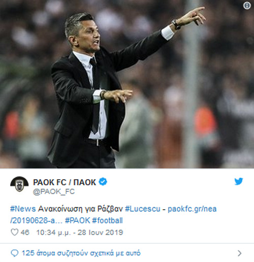 Ο ΠΑΟΚ εύχεται στον Ράζβαν Λουτσέσκου καλή επιτυχία στη συνέχεια της καριέρας του».