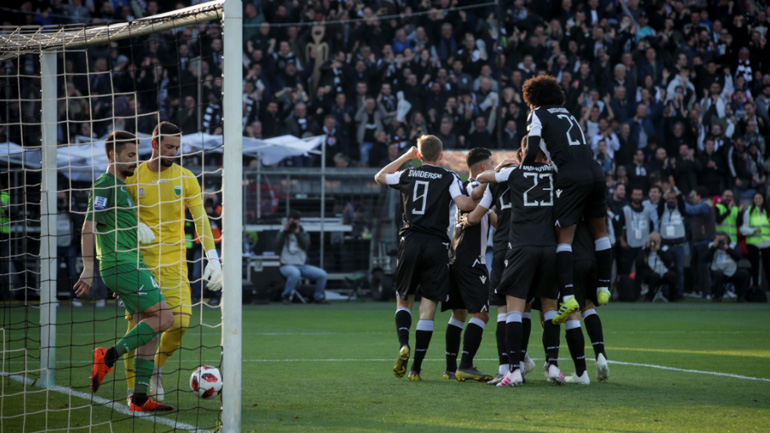 Με το σφύριγμα της λήξης του διαιτητή Κομίνη οι παίκτες και το τεχνικό επιτελείο των «ασπρόμαυρων» έγιναν ένα… κουβάρι και πανηγύριζαν σαν μικρά παιδιά την επιτυχία τους, ενώ στη συνέχεια οδηγήθηκαν στα αποδυτήρια προκειμένου να αρχίσουν οι ετοιμασίες για την απονομή του τίτλου.