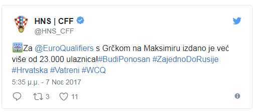 Η Ποδοσφαιρική Ομοσπονδία της Κροατίας ανακοίνωσε ότι έχει ήδη διαθέσει 23.000 εισιτήρια για το ματς των μπαράζ του Παγκοσμίου Κυπέλλου κόντρα στην Ελλάδα. Το ματς θα διεξαχθεί στο «Μάξιμιρ», που χωράει 35.123 οπαδούς και όλα δείχνουν ότι οι Κροάτες θα ανακοινώσουν sold-out πριν τη σέντρα.