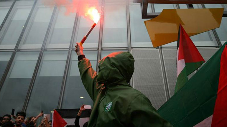 Η αστυνομία από την πλευρά της προειδοποίησε πως η ενέργεια αυτή, θα συνιστούσε πράξη υποκίνησης μίσους κατά ομάδος προσώπων. Παρά τις προειδοποιήσεις όμως, ακτιβιστές της «συμμαχίας για την Παλαιστίνη», μοίραζαν πριν ξεκινήσει ο αγώνας παλαιστινιακές σημαίες.