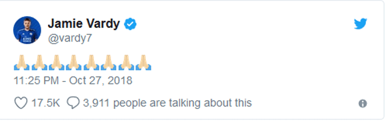 Ο Τζέικομπς έγραψε στο Twitter: «Μίλησα με την King Power, η οποία θα δημοσιεύσει επίσημη δήλωση αύριο (σ.σ. την Κυριακή). Ο ιδιοκτήτης της Λέστερ, Βικάι Σριβανταναπράμπα βρισκόταν στο οκταθέσιο ελικόπτερο που θα κατευθυνόταν προς το Λονδίνο. Ένα μηχανικό πρόβλημα αμέσως μετά την απογείωση προκάλεσε φωτιά πριν τη συντριβή στο πάρκινγκ».