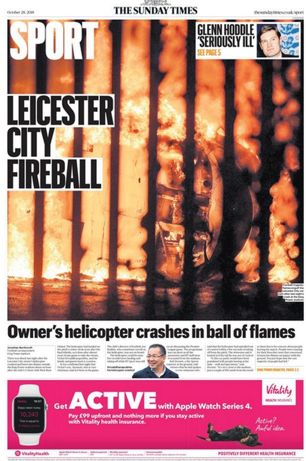 Η είδηση της συντριβής έχει συγκλονίσει το Νησί – και όχι μόνο. Χαρακτηριστικό είναι το πρωτοσέλιδο της Sunday Times που κυκλοφορεί με μία μεγάλη φωτογραφία με το ελικόπτερο να φλέγεται και γράφει: «Η φλεγόμενη μπάλα του Λέστερ. «Το ελικόπτερο του ιδιοκτήτη της Λέστερ συνετρίβη και τυλίχτηκε στις φλόγες».