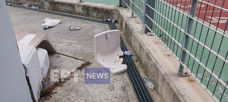 Ξηλωμένα καθίσματα, σπασμένοι νιπτήρες στις τουαλέτες αλλά και καταστροφές στο κυλικείο ύστερα από διάρρηξη συνθέτουν το σκηνικό στο στάδιο την επόμενη μέρα μετά την αναμέτρηση. Παράλληλα υπάρχουν καταστροφές που έχουν να γίνει και σε άλλους χώρους εκτός από τις κερκίδες με σκουπίδια, άδεια τενεκεδάκια αναψυκτικών και μπύρας που εκτοξεύτηκαν στο ταρτάν και τον αγωνιστικό χώρο του γηπέδου.
