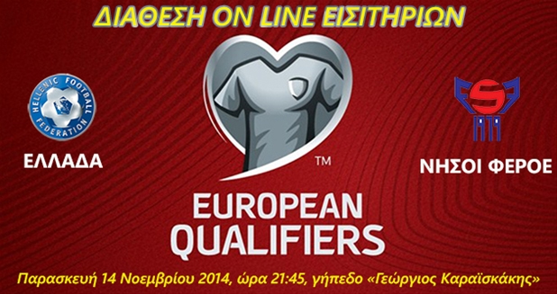 «H Ελληνική Ποδοσφαιρική Ομοσπονδία ενημερώνει τους φίλους της Εθνικής Ανδρών ότι άρχισε η διαδικασία της online πώλησης εισιτηρίων για τον αγώνα του αντιπροσωπευτικού μας συγκροτήματος με τις Νήσους Φερόε για τα προκριματικά του Euro 2016, ο οποίος θα διεξαχθεί στις 14/11/2014 και ώρα 21:45 στο γήπεδο «Γ. Καραϊσκάκης».