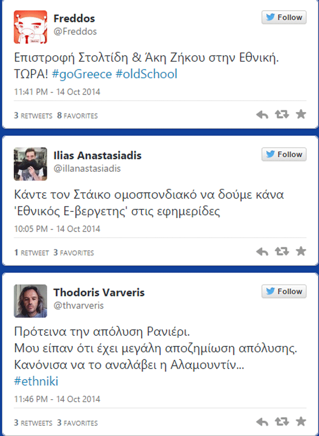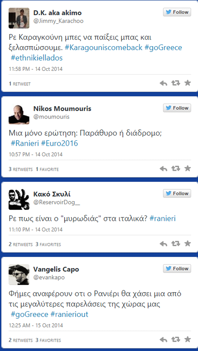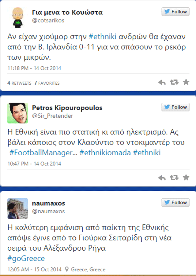Αντικείμενο σχολιασμού έγινε στο twitter η απόδοση της Εθνικής και η –αναπάντεχη- ήττα (2-0) από τη Β.Ιρλανδία στο Καραϊσκάκη.