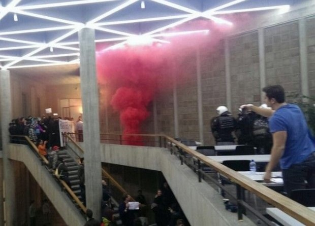 Οι φοιτητές είχαν πανό που ανέγραφε «Διώξτε μακριά τον Μπλάτερ», ενώ εκτόξευσαν ακόμα και καπνογόνο! Για να εκτονωθεί η κατάσταση χρειάστηκε η επέμβαση των αστυνομικών δυνάμεων.