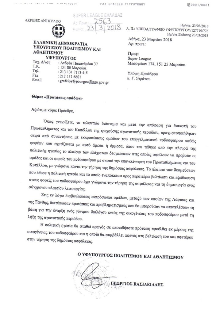 Η ΠΑΕ ΑΈΛ δημοσίευσε την επιστολή που έστειλε ο Υφυπουργός αθλητισμού στην Σούπερ Λίγκα, μετά τη συνάντησή του με τους εκπροσώπους των ομάδων, για τη διακοπή του πρωταθλήματος.