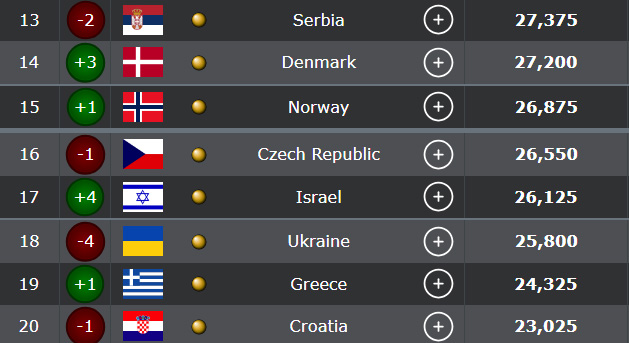 Υπενθυμίζεται πως 15η είναι η Νορβηγία, με Τσεχία, Ισραήλ και Ουκρανία να μεσολαβούν προ της Ελλάδας.