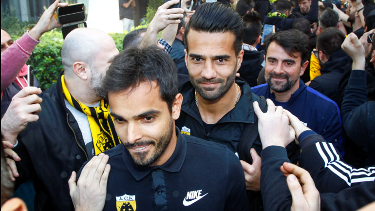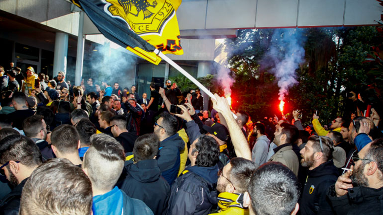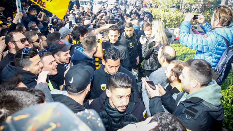 Πριν την αναχώρηση της ΑΕΚ για τη Θεσσαλονίκη, εν όψει του μεγάλου ντέρμπι με τον ΠΑΟΚ, αρκετοί φίλοι της Ένωσης συγκεντρώθηκαν στο ξενοδοχείο, που είχε καταλύσει η αποστολή, «ντοπάροντας» ψυχολογικά τους παίκτες και το τεχνικό επιτελείο της ομάδας, πριν το κρίσιμο παιχνίδι της Τούμπας.