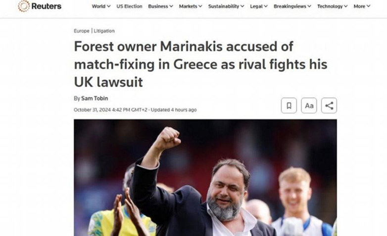 «Ο Ευάγγελος Μαρινάκης, ένας Έλληνας μεγιστάνας της ναυτιλίας και ιδιοκτήτης της αγγλικής ποδοσφαιρικής ομάδας Νότιγχαμ Φόρεστ, κατηγορήθηκε την Πέμπτη ότι προσπάθησε να στήσει έναν αγώνα ελληνικού ποδοσφαίρου. Η κατηγορία διατυπώθηκε κατά την εκδίκαση αγωγής για συκοφαντική δυσφήμιση σε δικαστήριο του Λονδίνου.